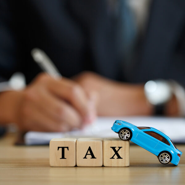 Car tax concept. close up tax wooden text with a toy car. saving money for transport, Man signing car insurance documents or lease papers. Writing signature on contract or agreement.